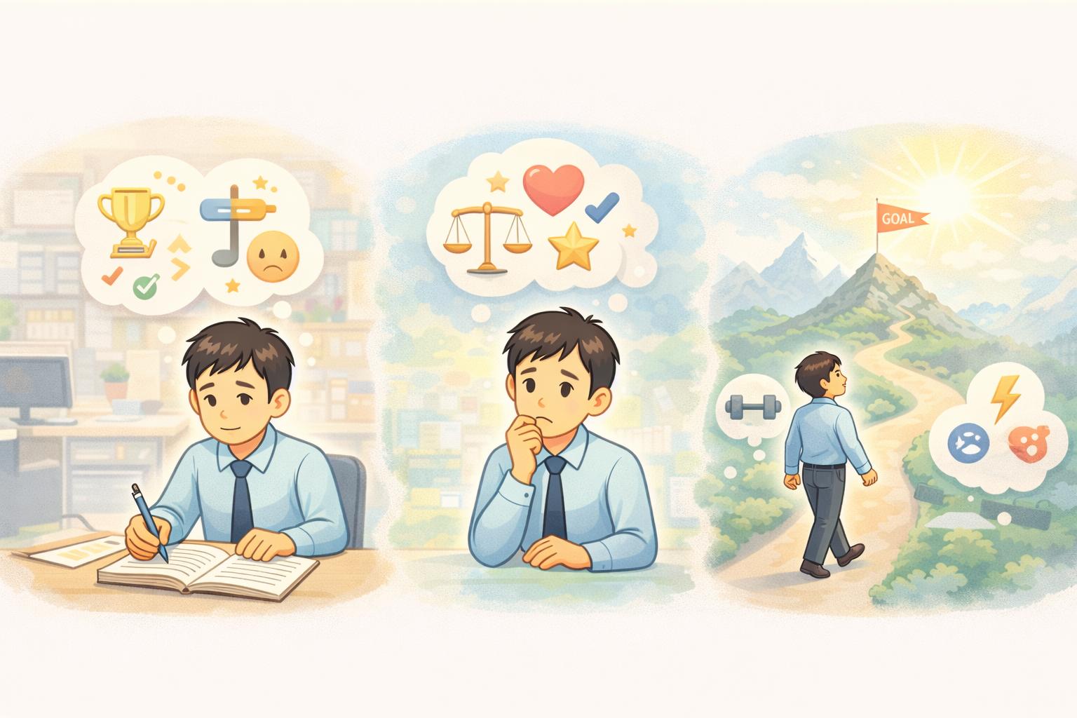 ライフスタイル:どのようなライフスタイルが理想か、ワークライフバランスをどう考えるかをはっきりさせましょう。どんな要素が充実感を与えてくれるのかを具体的に想像し、整理します。